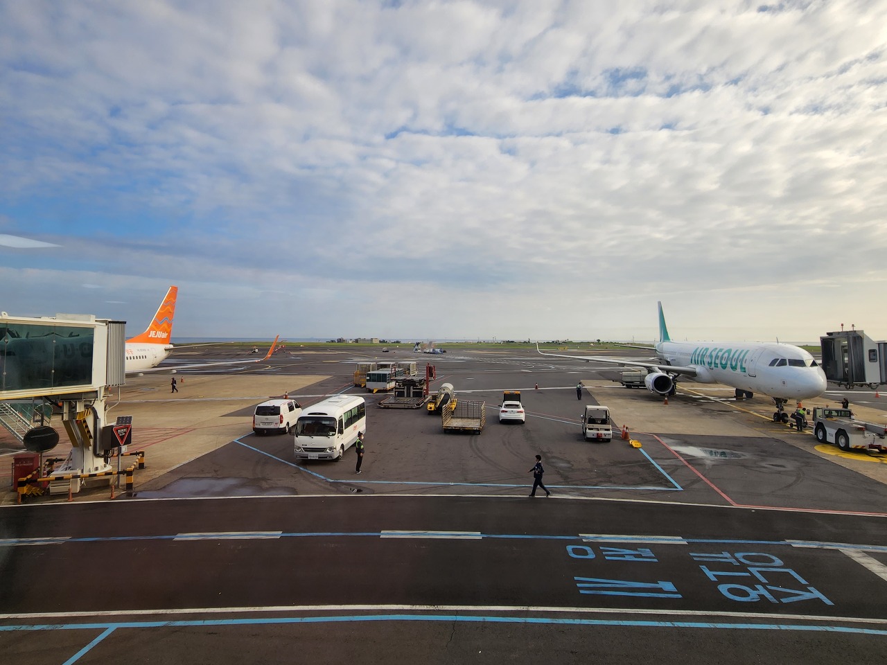 곧 우리가 탑승할 제주항공 비행기가 보입니다. 드디어 출발의 순간이 다가왔군요.